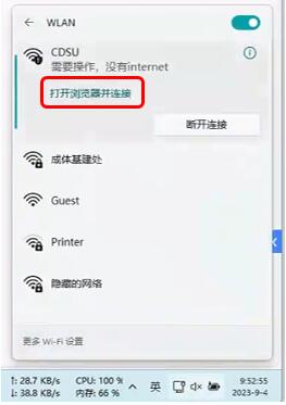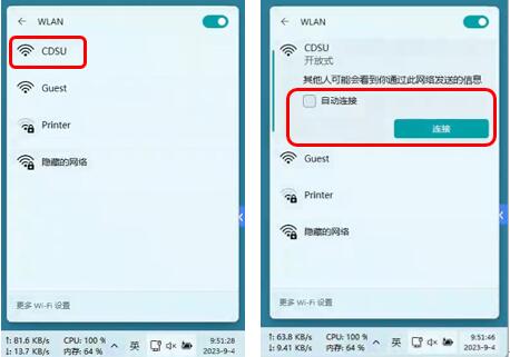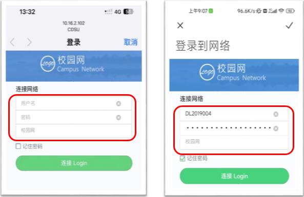 (3) 等待弹出登录页面,输入用户名、密码(默认用户名密码见登录页面),选择校园网点击“连接”;