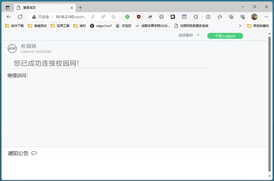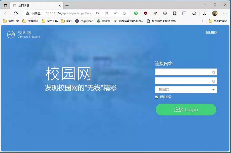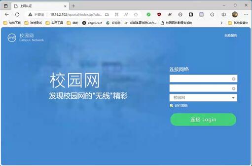 2. 打开浏览器输入任意网址,等待弹出登录页面,输入用户名、密码(默认用户名密码见登录页面),选择校园网点击“连接”;