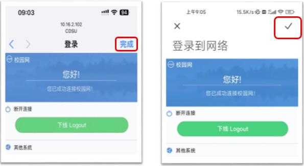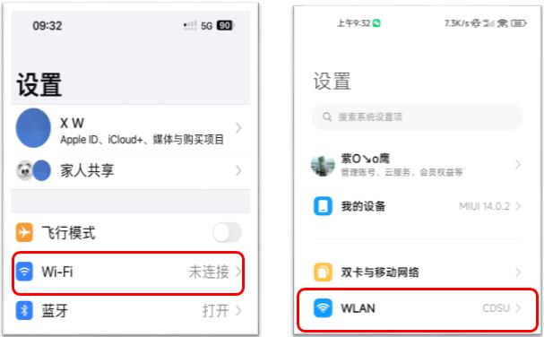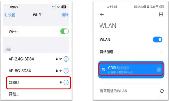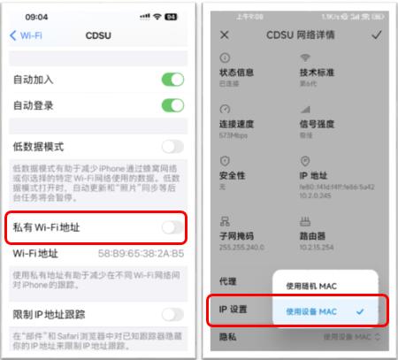 (5) 开启无感知认证(否则换个地方就会弹出登录页面),选择刚连接的“CDSU”,IOS系统关闭“私有WiFi地址”,安卓系统将“IP设置”切换为“使用设备MAC”。。