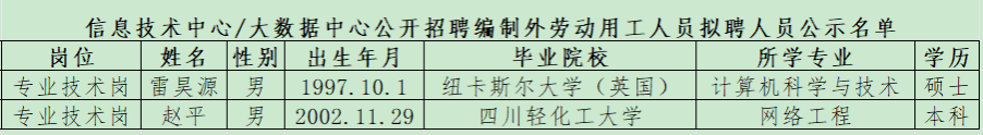 按照《成都体育学院信息技术中心/大数据中心公开招聘编制外劳动用工人员公告》的招聘程序,经报名、审核、面试及体检,现将信息技术中心/大数据中心拟聘人员予以公示(名单见下表)。